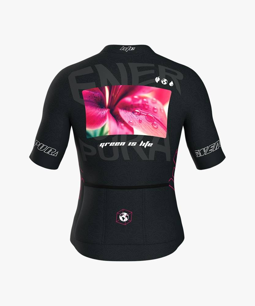 T-shirt: Two-way stretch technical shirt, long zip for total opening, raglan-cut short sleeves, for greater aerodynamics and adherence during sport’s activities. Part of the sleeves are perforated to allow perfect breathability in areas subject to greater sweating during activity. “Raw cut” sleeves bottom to make them adhere perfectly to the arms without stressing. Bottom with stretch fabric with hypoallergenic silicone grip for optimal fit. Three large rear pockets. Sublimation printing with water colors. 93% Polyester, 7% Elastane. GARMENT MADE WITH FABRICS DERIVING FROM THE RECYCLING OF PLASTIC BOTTLES AND TOTALLY RECYCLABLE.